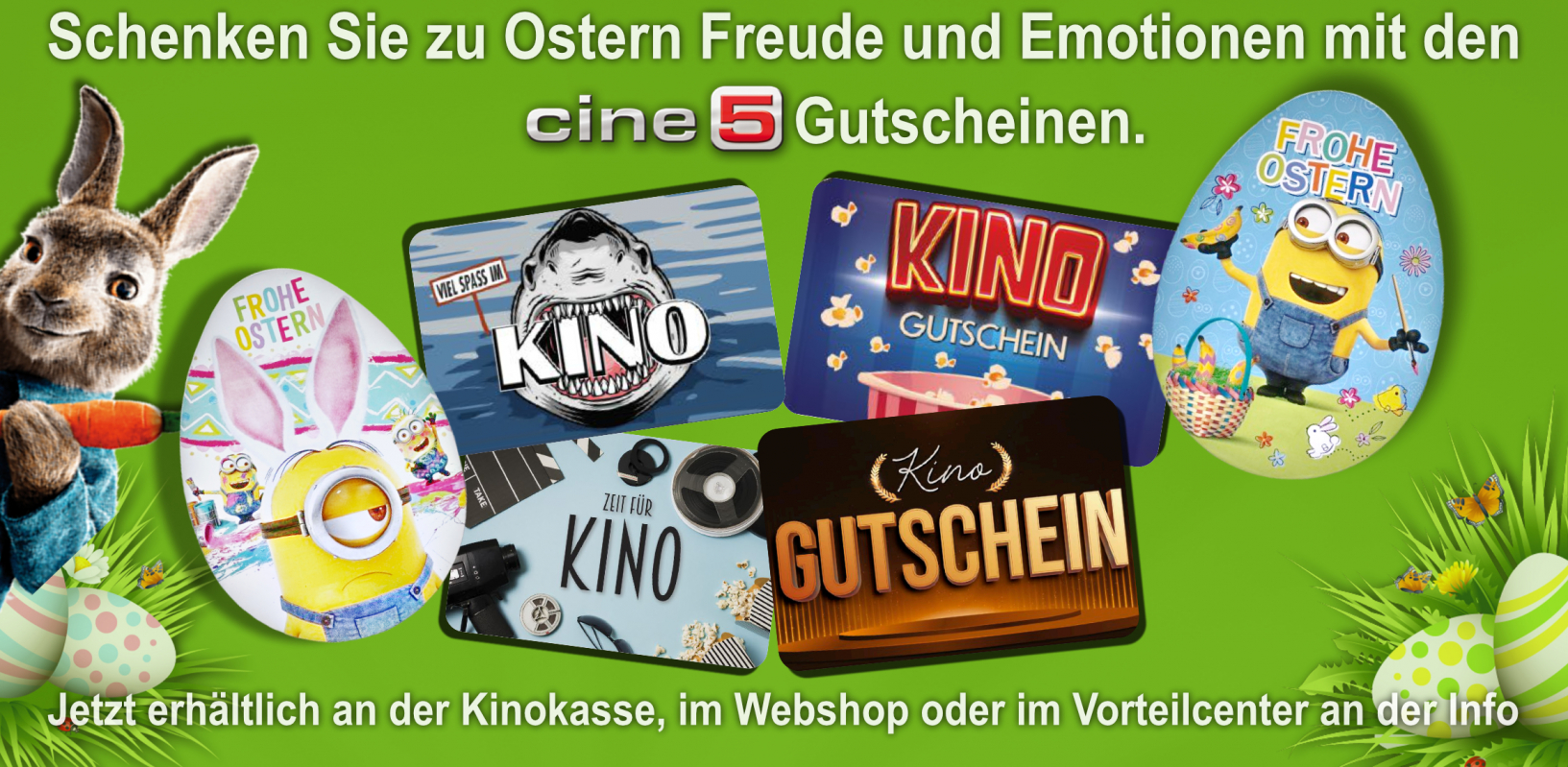 So sehen echte Oster-Überraschungen aus: Abenteuer, Action und viel Gefühl sind in den Geschenk-Gutscheinen vom Cine5 enthalten, mit denen sich jeder kleine und große Beschenkte im Handumdrehen den Kinowunsch erfüllen kann, der ihn wirklich begeistern wird.